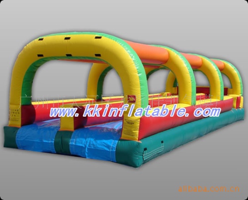 我公司充气类产品是采用新型的夹网PVC环保材料制作而成。材料中的夹网是高强度涤纶丝经编织物,优质的PVC浆,采用刮涂的方法涂在夹网两面。此种材料目前是国际上普遍采用的气膜材料。