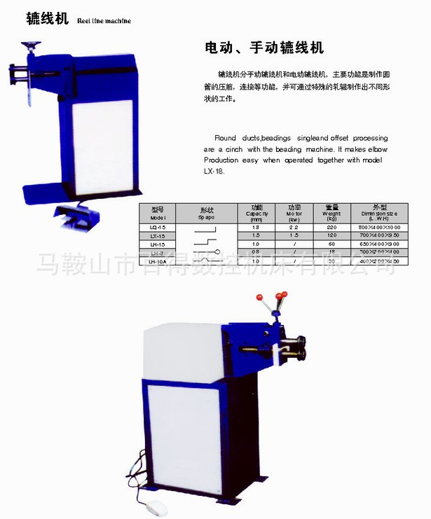 辘线机分为手动辘线机和电动辘线机,主要功能是制作圆管的压筋,连接等功能,并可通过特殊的轧辊制作出不同形状的工作。