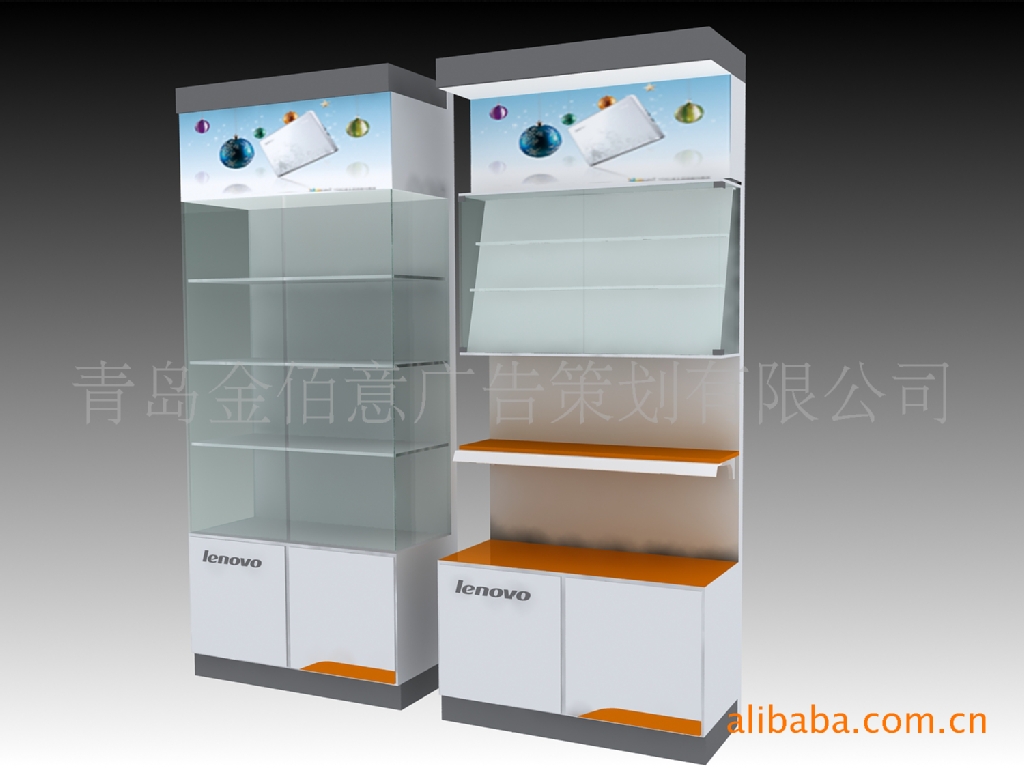 产品说明:抽拉式灯箱,便于更换画面;三面玻璃,展柜通透性好;个性化亚克力展架,突出售卖热点。