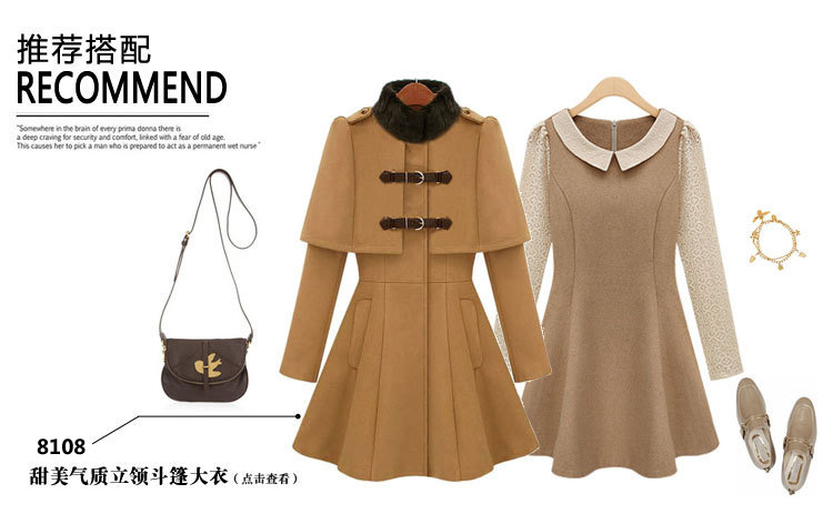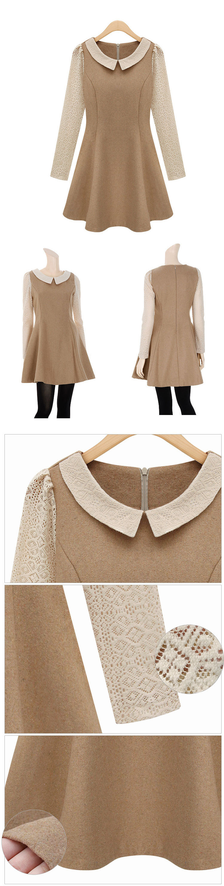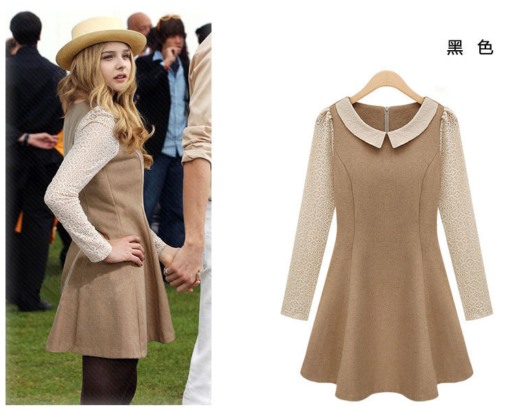 2013精品秋季欧美女装淑女时尚蕾丝拼接娃娃领毛呢长袖连衣裙批发