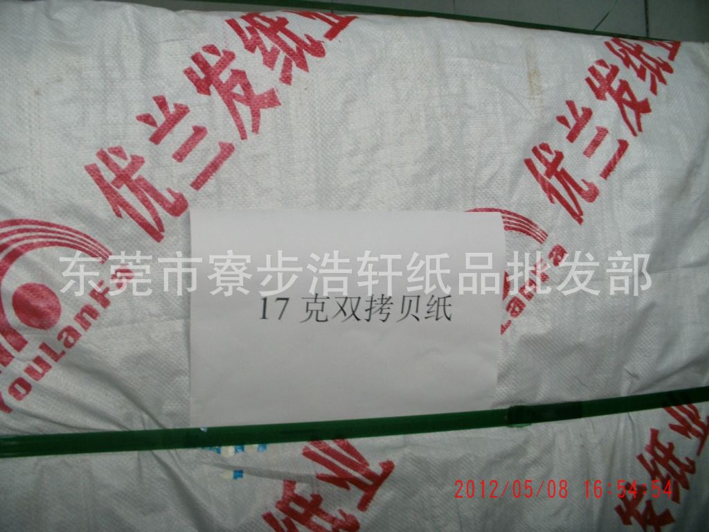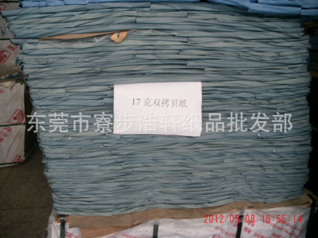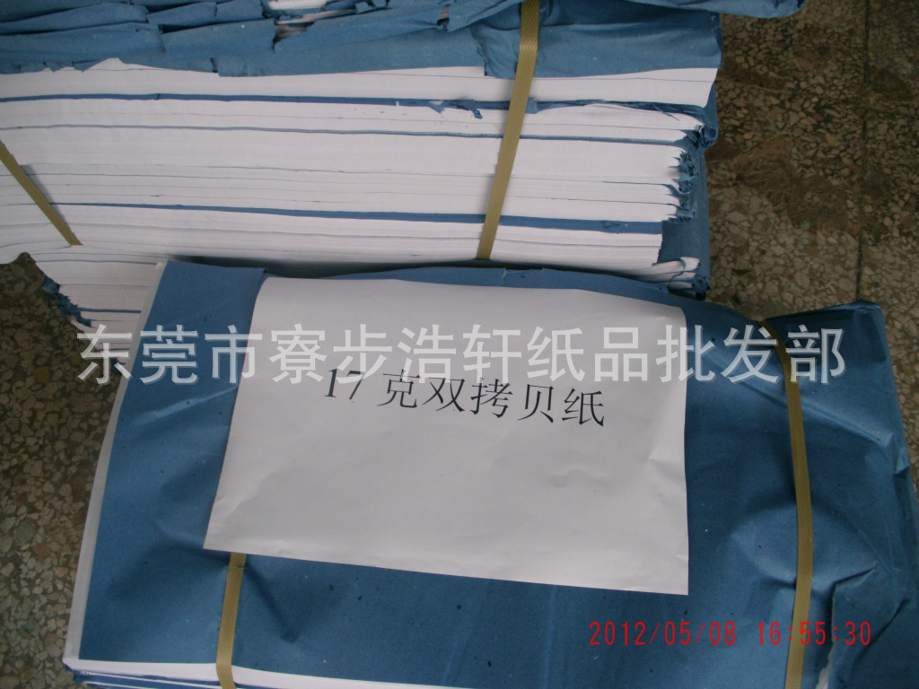 品 种:17克双拷纸。用 途:用于对鞋厂、手袋厂、制衣厂等的中低档包装;厚 度:17克。规 格:52*95、53*96、69*99、70*100、72*102、74*104、78*108、正度、其他规格可以定做.特 点:17克拷贝纸用进口纯木桨做原料。环保无毒,符合国际出口标准,可提供SGS及相关检