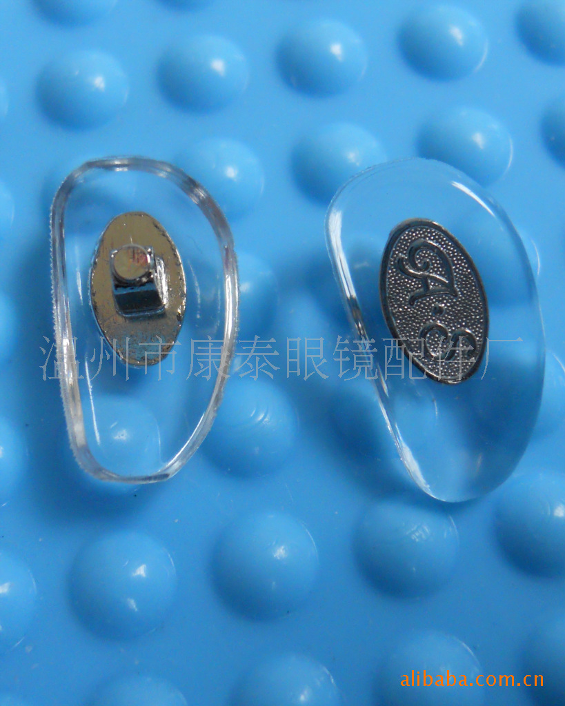 鼻托有两类,一类为固定型,即非金属类粘接型;一类为托叶活动型。后一类型的鼻托应用于金属架,现一些高档板材眼镜上也有,借助托梗焊接将活动托叶固定。我们仅以后一种类型为例来介绍一下鼻托。此型鼻托为最常用型,较前一种配适的舒适性更好,因为这类鼻托可以以螺钉为轴、上下可做20度- 40度的自然调整,有的甚至其调整角度可达到60度;左右方向的调整可以在10度- 30度,个别镜架也可以达到60度。活动托叶型鼻托的基本结构,这类鼻托有两部分构成,一为托叶部分,一为托臂部分。托叶部分由叶片和托桩构成其外部功能结构,托桩借助于基板包埋并固定在叶片中。托臂也是由两部分构成,一为托梗,一为桩盒,托梗为镜架本体(镜圈或梁)与桩盒的连接部,桩盒是容纳托桩的部件。托叶与托臂借助于螺钉构成为一个整体,这个整体有相当的调整空间,包括鼻托高度、叶片角度及叶片与镜架的相对位置等。