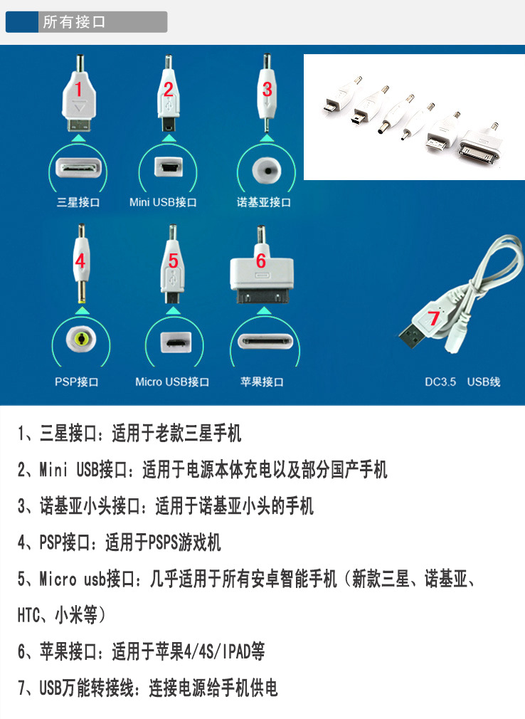 11.包装清单:产品*1/DC线*1/micro5P*1/mini5P*1/iphone*1/nokia*1