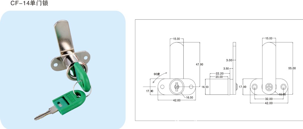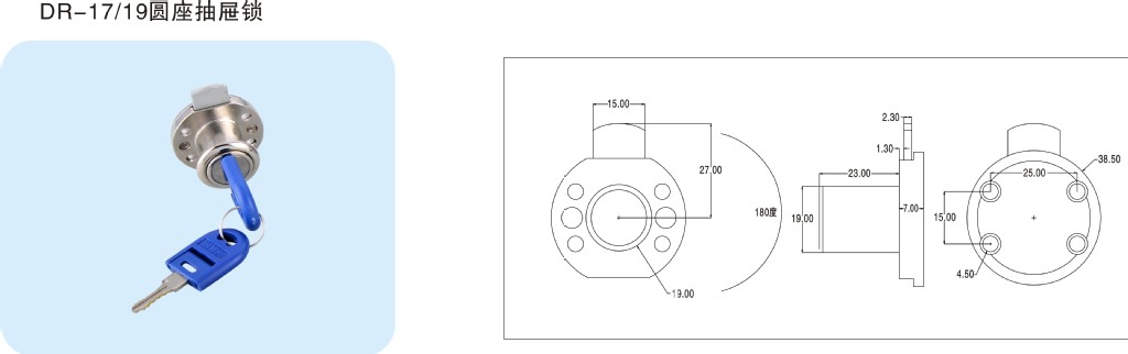 锁头锁舌材料为锌合金和铁。罩壳底版材料为锌合金,每把锁配2把全铜钥匙。锁头结构,锁头直径Φ19,锁头长度30MM.该锁有左右橱门锁和抽屉锁3种选择。整体电镀亮铬,镜面抛光,外形美观。锁包装为200PCS/件。该锁适合各种船用抽