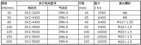 三、安装使用及维护 1、阀门安装时应选择配套执行器的型号、阀杆行程,出轴推力应符合表2所示 要求,输出轴的动作是否与阀位表相符。露天应保护,以防暴晒、雨淋。 2、安装时,两头法兰要紧固,以免在工作时造成胶管撕裂。 3、使用前应了解管道的工作压力,严禁超压使用。 4、发现滴漏现象应及时检修,如属胶管磨损,应及时更换。 表2 ZSX-D型电动管夹阀配套执行机构型号与规格