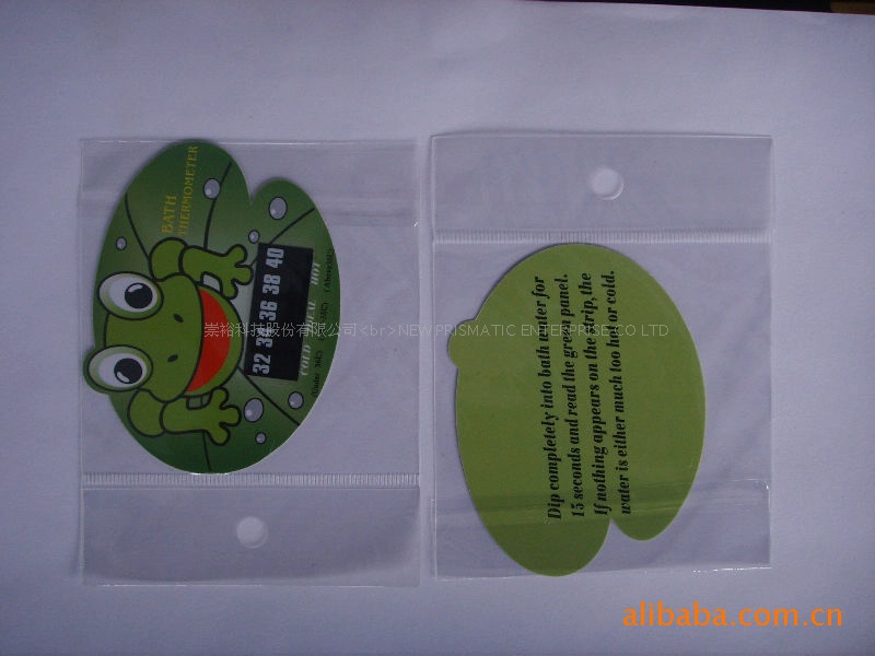 专门为婴儿沐浴安全设计的产品,将洗澡卡放在水中,能准确测出水温,避免婴幼儿洗澡时水温太凉或太热。特别说明:以上产品应用世界上最先进的液晶测温技术,通过颜色(绿色)来显示当前的温度,测量准确,读数明显、直观方便,一般能在15秒钟之内测量出温度,可以重复使用,又避免了传统温度计容易造成玻璃破碎和水银中毒的危害性,具有安全、环保、实用、价廉的优点。产品可以按照客户的设计、制作成各种图案、各种规格的卡片,成为根据客户创意生产的商品,或者在卡片上印制客户公司或产品的宣传内容,作为广告宣传促销礼品,起到扩大推广企业及其品牌知名度的效果。