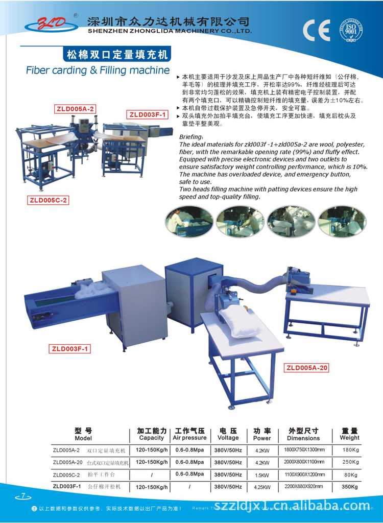 本机主要适用于沙发及床上用品生产厂中各种短纤维如(公仔棉,羊毛等)的梳理并填充工序,开松率达99%,纤维经梳理后可达到非常均匀蓬松的效果,填充机上装有精密纪电子控制装置,并配有两个填充口,可以精确控制短纤维的填充量,误差为±左右.
