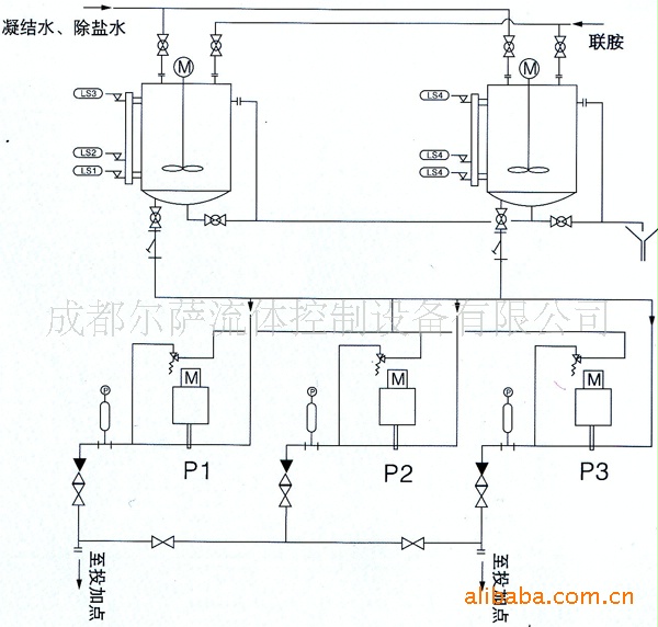 联胺由水射器吸入计量系统,然后按比例加入溶配系统与除盐水或冷凝水混合均