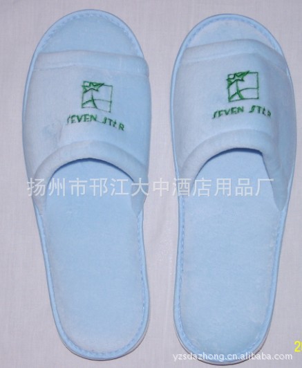 蓝色密丝绒一次性拖鞋。5mmEVA鞋底,27.5*11cm厂家专业生产酒店 宾馆 桑拿 会所中高档各款拖鞋及一次性客房用品