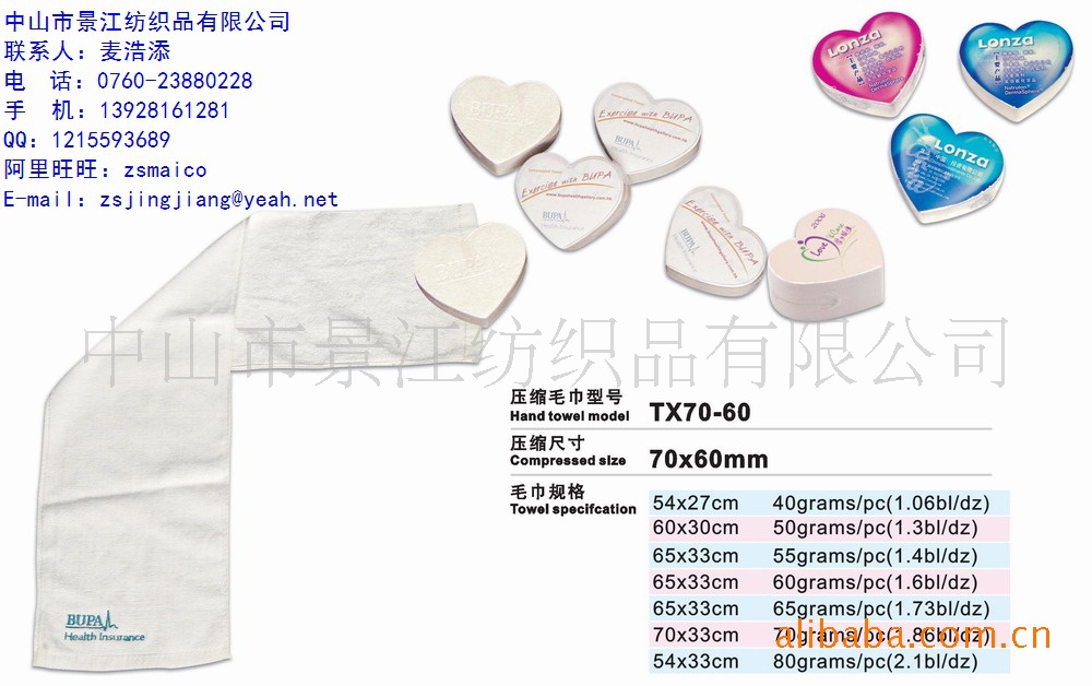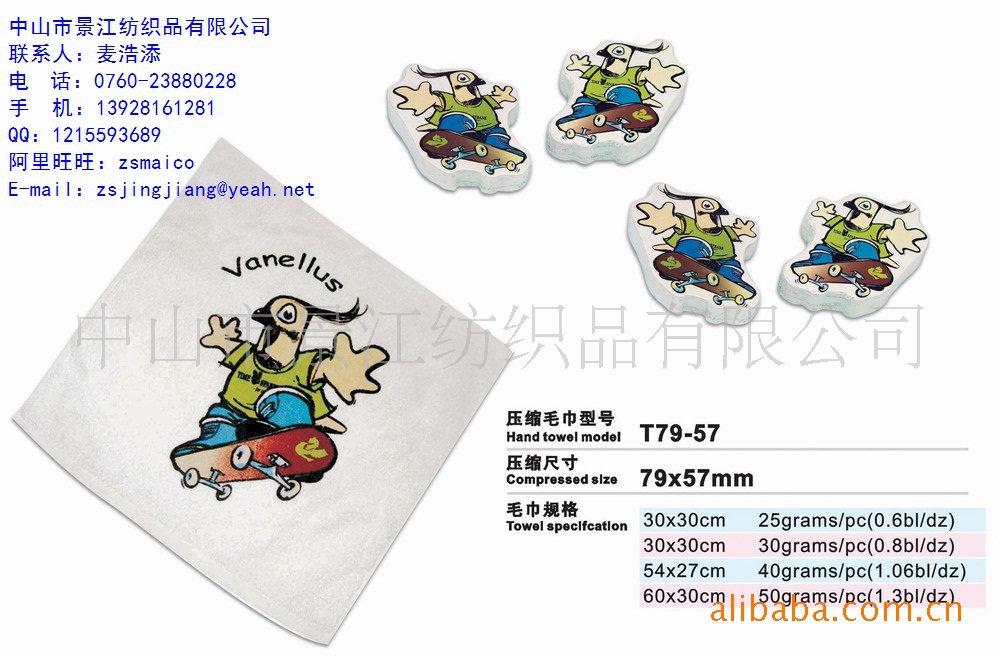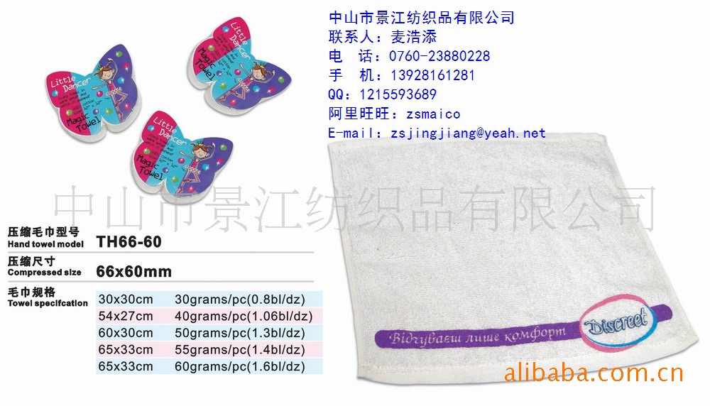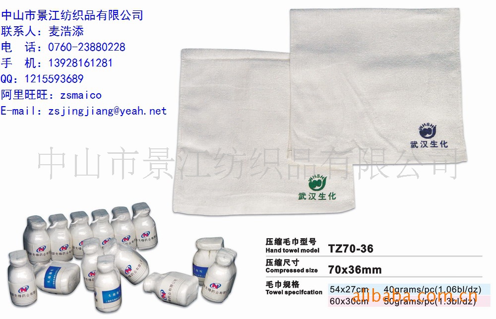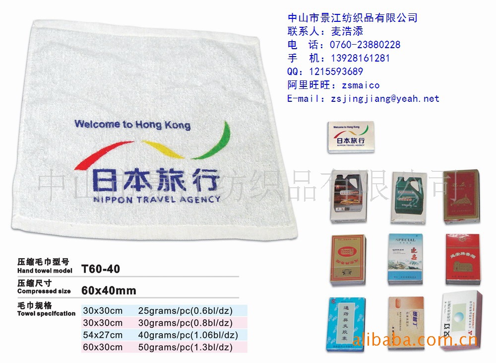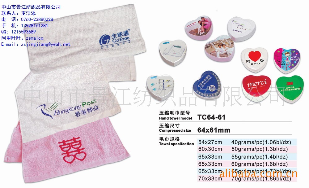中山市景江纺织品有限公司是专业生产酒店毛巾,酒店床上用品,无纺布制品,织带制品和各类型的广告毛巾、礼品毛巾、割绒活性印毛巾、色织毛巾、沙滩巾、高尔夫球巾、运动毛巾、广告T恤、压缩毛巾、压缩广告衫、压缩袜子、压缩男女内衣裤、压缩休闲裤等压缩制品的生产厂家,其中产品之一的压缩毛巾、压缩广告衫是二十一世纪的高级环保、高科技成果、采用100%纯棉经高温压处理而成的新一代产品,放入水中浸片刻即可张开使用,本产品新奇独特,干净卫生,在产品企业形象宣传极具效力,广泛用于广告宣传界、酒店、旅游公司、会所等,而本公司旗下品牌“可依(Coee)”已受到社会各客户的青睐。