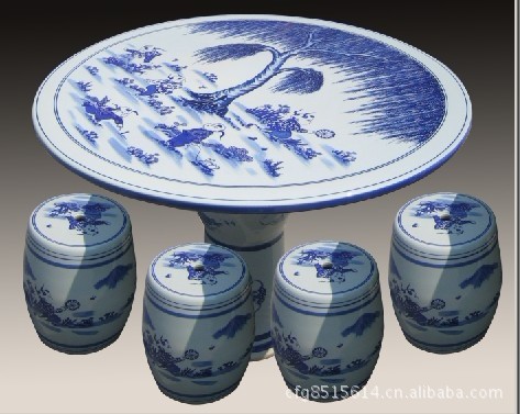 景德镇陶瓷桌凳具有不怕风吹雨打,历久如新,易清洁等特点。是家居使用、园林摆设、馈赠亲友的时尚用品。放置在庭院、露台、阳台雅致高贵。本公司完全采用景德镇传统手工陶瓷制作工艺制作。圆桌面、方桌面,青花、粉彩、墨彩等画面齐全,款式多样。工艺:陶瓷圆桌桌面直径一般为80厘米--90厘米,大点的可以做到130厘米,高约65厘米,图案可以是贴花,可以是手绘,可以是雕刻也可以是影青色,古铜色等等,可以根据可以的要求订制,一套包括四个凳子,一个桌面一个桌腿,本厂也承接各类桌面或者是陶瓷凳子的加工订做。