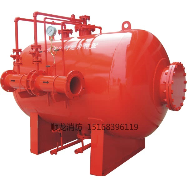 压力式泡沫比例混合装置由泡沫液储罐、胶囊、压力式比例混合器、进水管、安全阀、控制阀门及一些辅助零部件等组成。体积1-15立方米,容积1000-15000L,流量10-96(L/S)。当压力水流经过该泡沫罐的比例混合器时,比例混合器将其按比例分流,其中一小部分水进入带胶囊的泡沫液储罐夹层,挤压胶囊,能使水与泡沫液(泡沫灭火剂)按 6%或3%的比例进行自动混合。输出的泡沫混合液供泡沫产生的喷射设备(泡沫消火栓、泡沫发生器等)产生空气泡沫进行灭火。该泡沫罐广泛用于油库储罐区、化工厂、机库、油田、燃油发电厂、锅炉房、地下车库、危险品仓库等场所的水喷淋-泡沫联用系统。