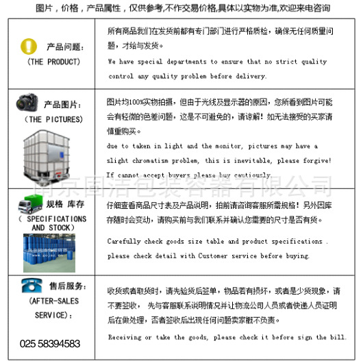 特别声明:南京固洁包装容器有限公司是江苏省南京市唯一具备吨桶,200L塑料桶生产企业,最新生产许可证号:(苏)XK16-204-00076;企业通过了ISO9001:2008国际质量管理体系认证,严控管理、生产等环节之成本,以优质的产品,低廉的价格,良好的售后服务,受到市场的认可,产品销往全球30几个国家。