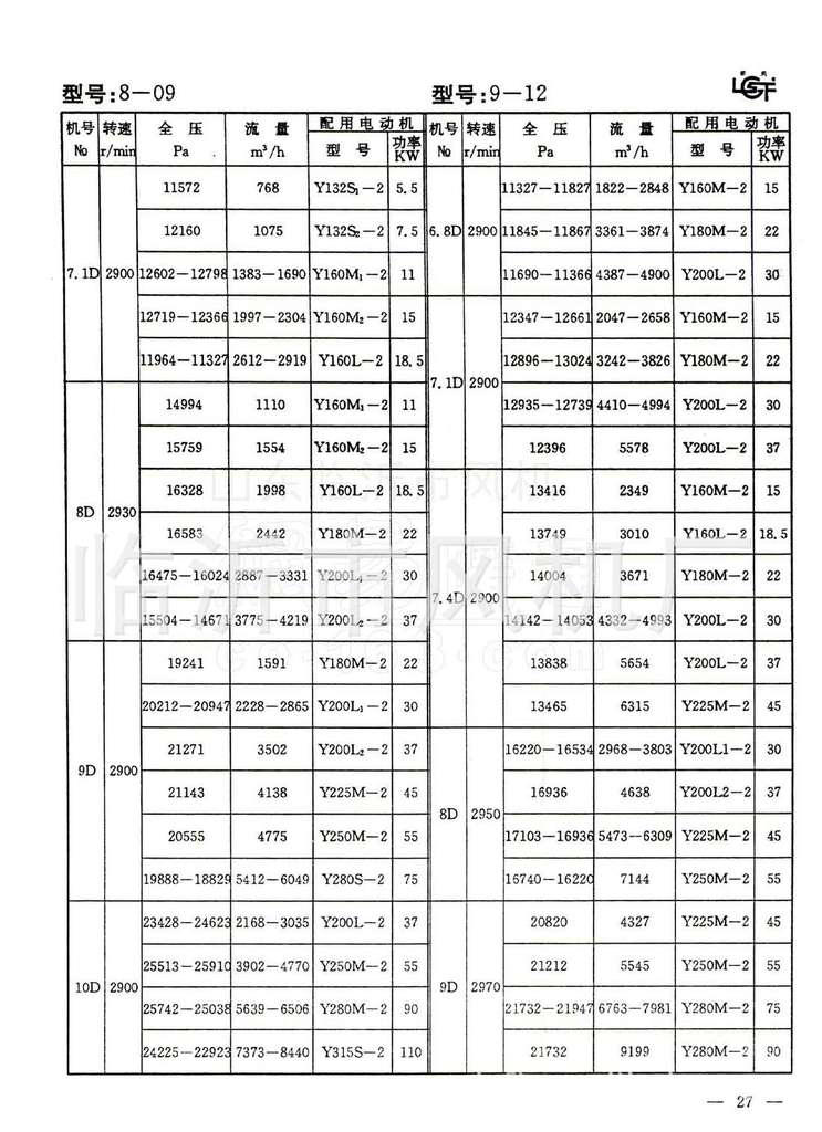 8~09、9~12型化铁炉专用高压离心风机,迁用于1、2、3、4、5、6、7、T/h熔化率的化铁炉鼓风性能要求。该风机还可作为各种熔炉、锻冶炉的鼓风用,也适用于输送空气入无腐蚀性、不自然、不含有粘性物质的气体,输送介质的温度不超过80℃,介质中所含的尘土及硬质颗粒不大于150毫克/立方米。 8~09、9~12型风机均为单吸入,8~09型风机有№7.1、8、9三种机号;9-12型风机有№6.8、7.1、7.4、8、9五个机号;均可制成顺旋转或逆旋转两种型式。从电动机一端正视,叶轮按顺时针方向旋转,称为顺旋风机,以“顺”表示,按逆时针方向旋转,称逆旋风机,以“逆”表示。风机的出口位置以机壳的出口角度表示,“顺”“逆”风机均可制成0°、90°、180°三种角度。 风机的传动方式为D式(电机与传动组采用联轴器联接)。 8~09、9~12型化铁炉专用高压离心风机性能参数表