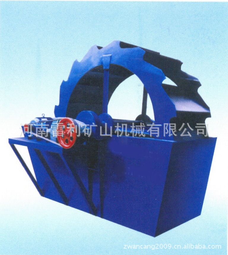 洗砂机工作时,电机通过三角带、减速机、齿轮减速后带动叶轮缓慢转动,砂石有给料槽进入洗槽中,在叶轮的带动下翻滚,并互相研磨,除去覆盖砂石表面的杂质,同时破坏包覆砂粒的水汽层,以利于脱水;同时加水,形成强大水流,及时将杂质及比重小的异物带走,并从溢出口洗槽排出,完成清洗作用。干净的砂石由叶片带走,最后砂石从旋转的叶轮倒入出料槽,完成砂石的清洗作用。