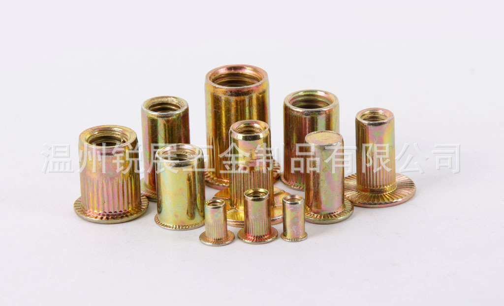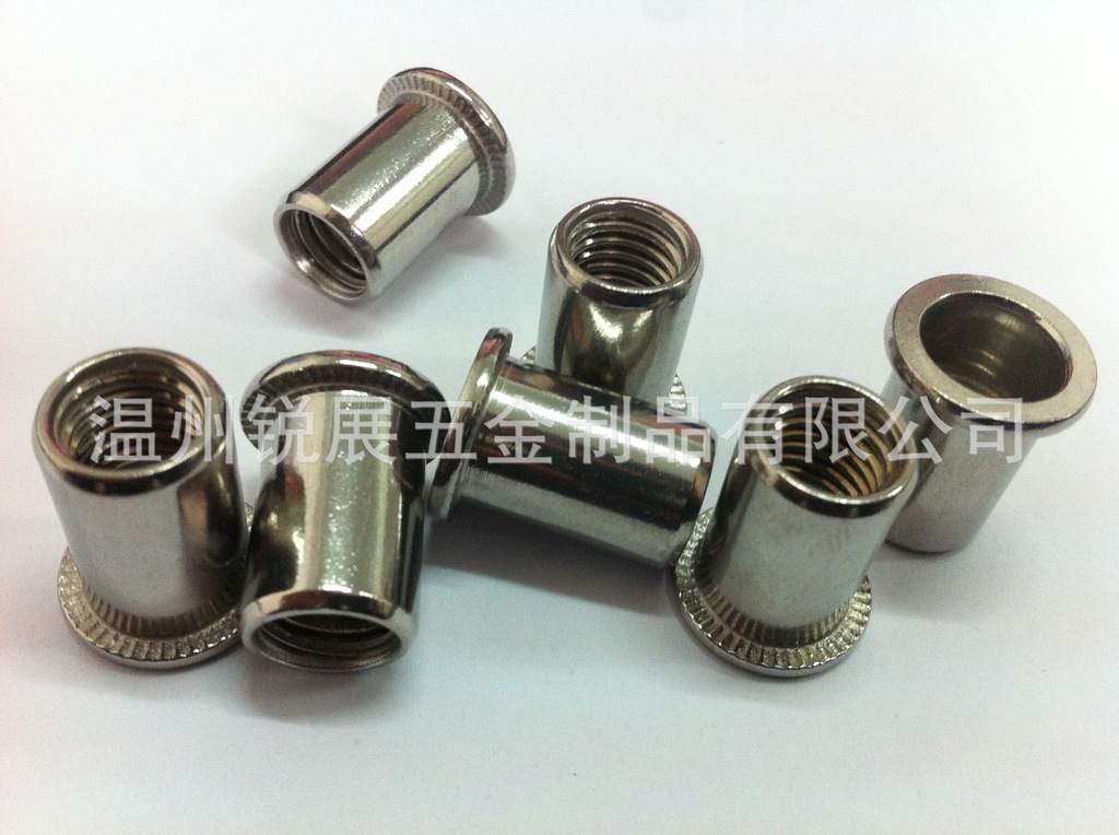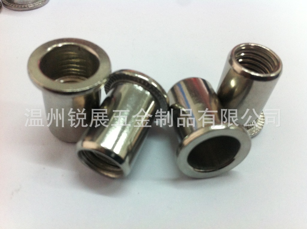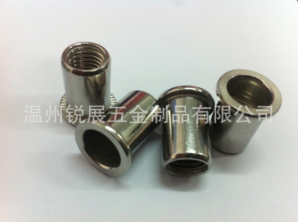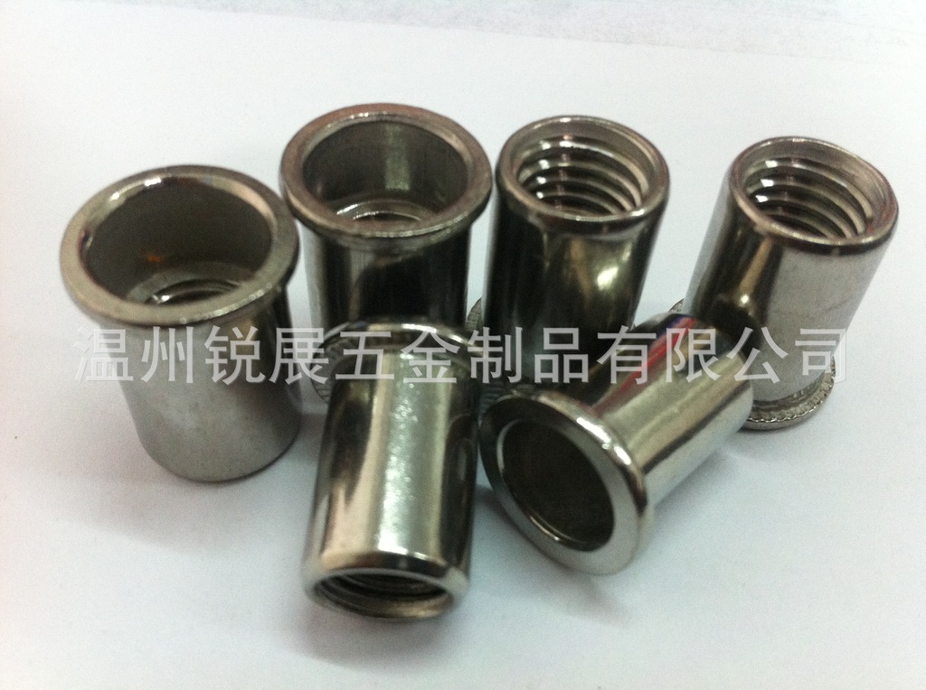 又称拉铆螺母,拉帽,用于各类金属板材、管材等制造工业的紧固领域,广泛地使用在汽车、航空、铁道、制冷、电梯、开关、仪器、家具、装饰等机电和轻工产品的装配上。为解决金属薄板、薄管焊接螺母易熔,基材易焊接变形,攻内螺纹易滑牙等缺点而开发,它不需要攻内螺纹,不需要焊接螺母、铆接牢固效率高、使用方便。