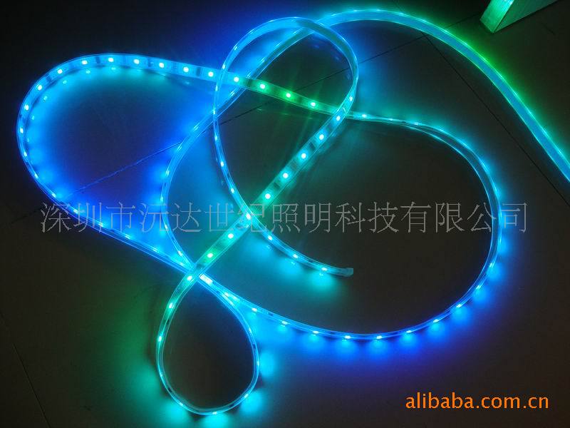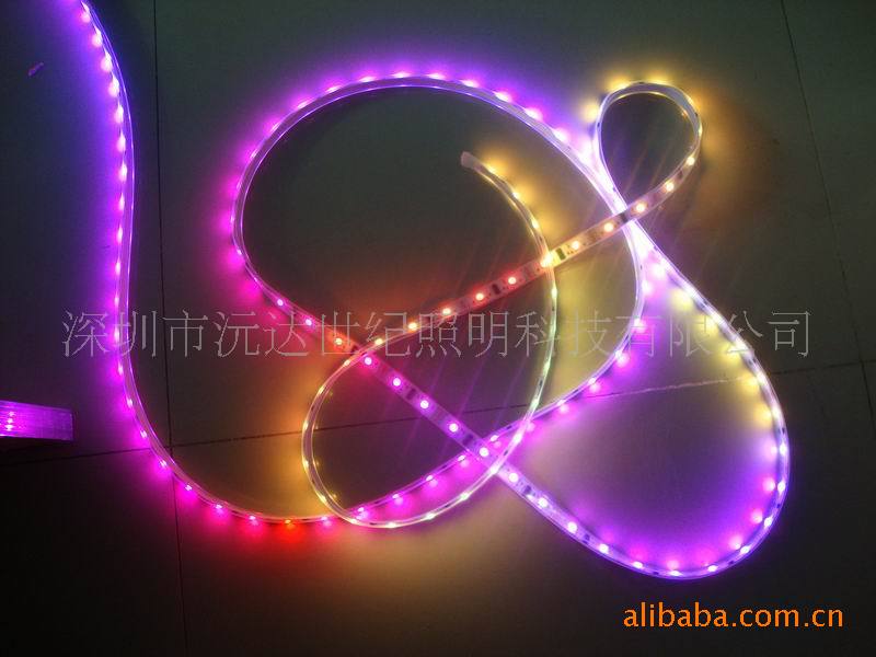 5005幻彩柔性灯条是采用5050高亮度贴片LED为发光源;发光均匀细腻,色彩亮丽,颜色丰富。具备柔软、可折叠弯曲,随意打结、裁减、拼接等特点,而不会影响发光性能。可直接使用透明胶带、胶水、别针、线钉、透明塑料卡等固定于装饰物体表面。广泛应用于玻璃、橱窗、家具、门窗、墙体等处,使用方便快捷。还可以使用扉边型缝扎于布料、皮革、服装表面及边缘。变化达80多种效果,达到霓虹灯的效果,省电、长寿命、品质稳定。是取代霓虹灯的首选产品。