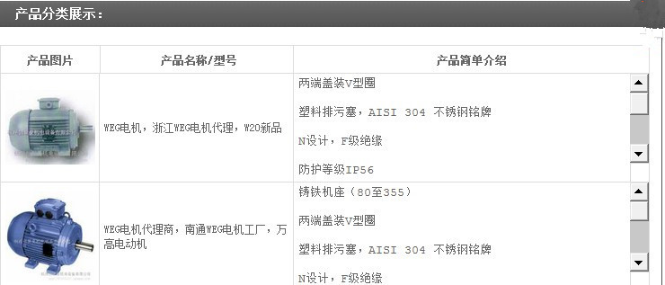WEG-W20电机标准特征:三相多电压,IP55,TEFC;铸铁机座(80至355);两端盖装V型圈;塑料排污塞;AISI 304不锈钢铭牌;N设计;F级绝缘;油漆颜色:RAL 7000(gray)。