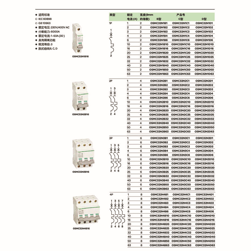 - OSMC32N/C65H系列小型断路器为模块化产品,10kA 分断能力,每极产品均统一为9mm宽度,变繁为简.