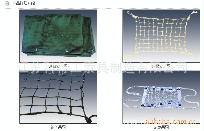 主要产品有:安全防护网、阻燃安全网、钢丝吊网、尼龙吊网、尼龙扁平吊网、编织绳网、尼龙网、特种安全网、围拦网、跨越网、货柜网等。材质:丙纶 、涤纶、锦纶等。