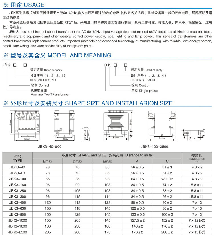 JBK系列机床控制变压器为干式空气自冷型变压器,适用于额定频率50~60Hz,额定电压660V以下,额定输出电压不超过380V的电路中。通常作机床、各类机械的一般控制电源或局部照明灯及指示灯的电源之用。本系列变压器是其它控制变压器的更新换代产品,具有工作可靠、耗能低,体积小、接线安全、适用性文等特点。产品符合GB/T 5226.1-1996、JB5555-91标准。