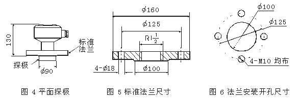 如上图4示为平面探极,它适用于冲击较强的块状物料。平面探极为法兰安装 ,只能采取侧装。