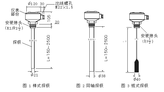 如上图3示为同轴探极,它适用于非金属仓壁的液体物料。同轴探极为R1.5"管螺纹安装或螺纹法兰安装,安装方法同棒式探极,应注意使壳体接通大地。