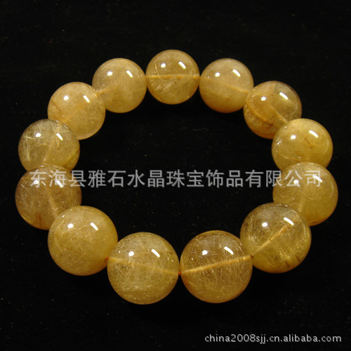 金发晶: 质地佳而少见的金发晶。极旺财运,加强自身气势,避邪化煞,有助于改善肠胃、肝胆等病症,其能量比其它水晶更为强大。 金发晶又有人称为维纳斯发晶,因为其金色的发晶酷似维纳斯一头柔软的金发而得名。是一种权威水晶,极具权势象征,因为它的气场能量极强,除了能辟邪外,还可可增强人体生物气场,增加胆识,实为进取心强烈,期望做大事者不可缺少的开运宝石。金发晶被认为能招财聚气. 正财偏财都招,磁场特强。