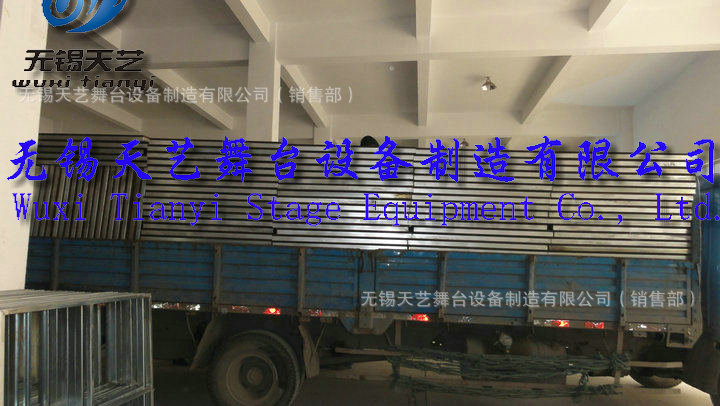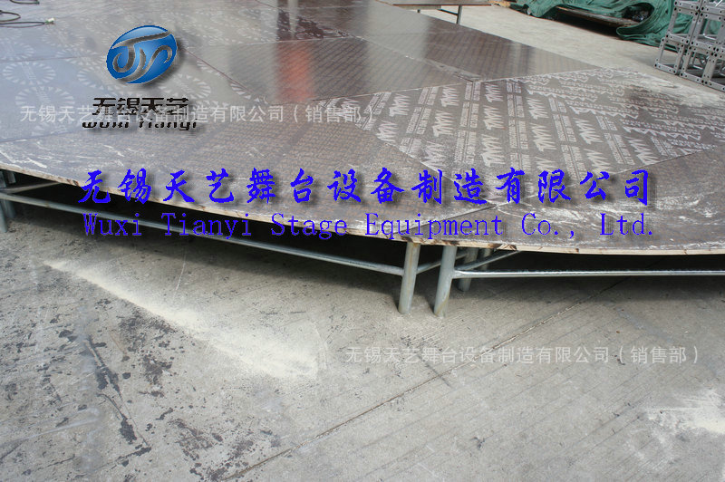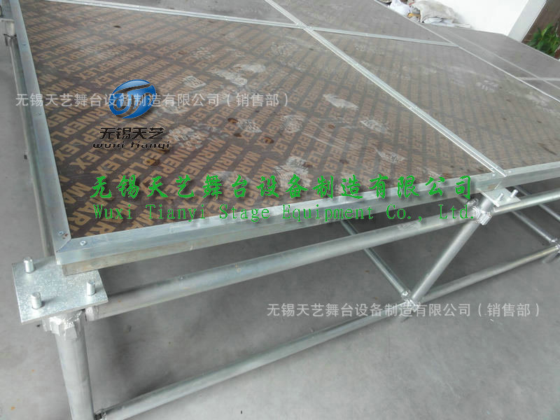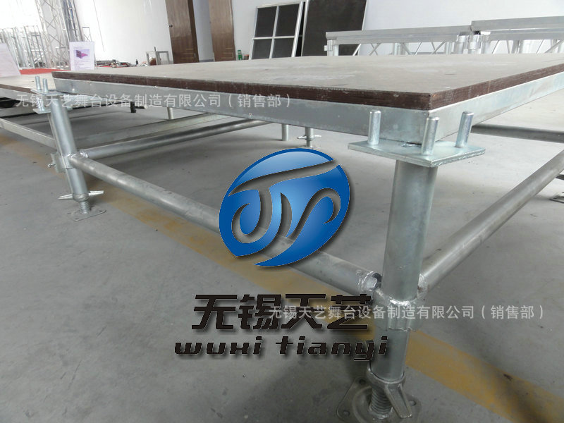 钢制拼装舞台特点是安装轻便,快速,安装过程中无需任何安装工具,每100平方舞台搭建速度为30分钟左右,舞台由舞台板,舞台框架,舞台立杆,舞台横杆,舞台调节等部分组成,板架采用25*40的方管以十字钢撑的形式支撑建筑模板,模板两面覆膜,或选择(防滑板),可做出口,表面防水,模板厚度为18MM,其舞台每平方承载500KG,舞台整体冷镀锌镀锌处理工艺。舞台立柱均采用48*3的建筑钢管整体焊接而成,大面积搭建美观大方,搭建快速,舞台全向可拆,拆装方便,可调节,运输方便等特点受到全国客户的青睐,是临时演出,大型庆典活动舞台的首先器材 。 无锡天艺舞台设备制造有限公司是一家专业生产展览钢/铝桁架,钢/铝快装活动舞台,折叠舞台,玻璃舞台,展览篷房,铝合金灯光音响架,雷亚架,T台等广电传媒器材为一体的综合性的大型企业。公司位于国家级经济开发区 ,芙蓉工业园区A区蓉洋三路 32-1号,无锡东出口处8公里即可到公司,公司凭借着高质量的产品,良好的信誉,优质的服务,产品畅销全国近三十多个省、市、自治区以及远销南美、东南亚、欧美等国家。竭诚与国内外商家双赢合作,共同发展,共创辉煌。无锡天艺一直秉承“质量为首,服务为先,诚信为本”的经营理念,欢迎来公司参观洽谈。我们竭诚为您提供最优良的品质和最好的服务本公司始终坚持“以质量求生存为本”,本着“质量第一、信誉第一、竭诚服务、精益求精、不断创新”为宗旨,在国内市场奠定了良好的基础。为了更好的推行ISO质量管理体系,规范生产流程,严控把关产品质量,公司配备目前最先进的组装焊接与机械加工设备,流水线式的生产,不断提高生产技术和质量,确保以最优质的产品来满足客户的需求。