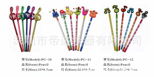 有多种款式的音符铅笔,卡通乐器铅笔,高音符号铅笔,还有乐器造型铅笔。