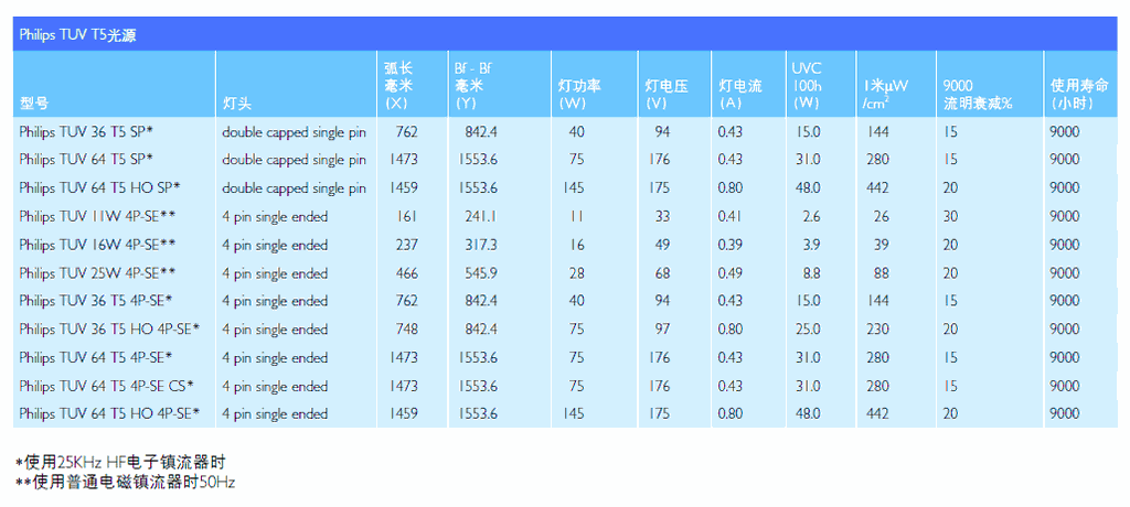 飞利浦TUV T5系列采用比普通直管光源直径更小的玻管。它们有多种尺寸、灯头和输出功率。从单针到单头,从普通输出功率到高输出功率(HO),确保每一个种应用总有一款合适的光源。光源中的汞含量极低,使之成为市场上首款符合严格TCLP规定的光源,被认为不会产生有害废弃物。