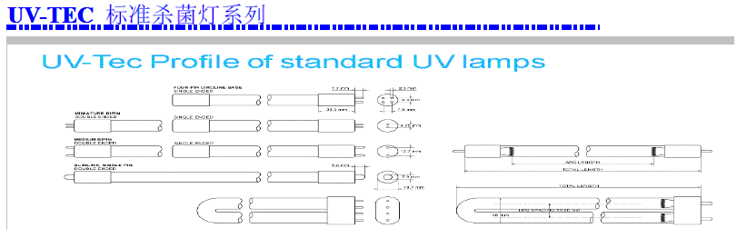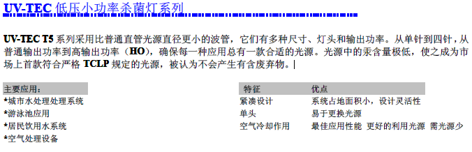 UV-TEC低压小功率杀菌灯系列 UV-TEC T5系列采用比普通直管光源直径更小的波管,它们有多种尺寸、灯头和输出功率。从单针到四针,从普通输出功率到高输出功率(HO),确保每一种应用总有一款合适的光源。光源中的汞含量极低,使之成为市场上首款符合严格TCLP规定的光源,被认为不会产生有含废弃物。