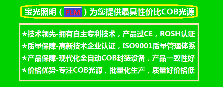 2、我司所有COB光源均使用台湾正规芯片制作,所有COB光源质保三年(按照我司使用标准范围内)