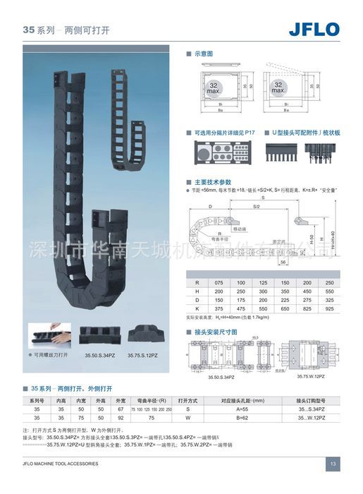 华南天城机床配件有限公司是一家研发、设计、生产、销售为一体大型企业,专业生产JFLO拖链、HP拖链、工程塑料拖链、钢铝拖链、不锈钢拖链、JR-2型矩形金属软管、不锈钢导管套、机床防护罩、LED机床工作灯灯、防水防爆灯、LED警示灯、机床垫铁、不锈钢编织防爆管、冷却管、金属包塑软管、钣金件等配套产品。本公司凭借雄厚的实力与先进技术,在质量、制作工艺、售前售后服务等方面都领先于同行业。我司拥有模具车间(多台模具开发设备)、注塑车间(专业的拖链生产)、灯厂、电子厂(研发最新型机械照明产品)。最先进的生产设备、专业的生产技术,为客户提供一流的服务,产品规格齐全,价格便宜,深受到广大客户好评。我司以持著创新及热诚服务,热诚欢迎新老客户前来洽谈业务。