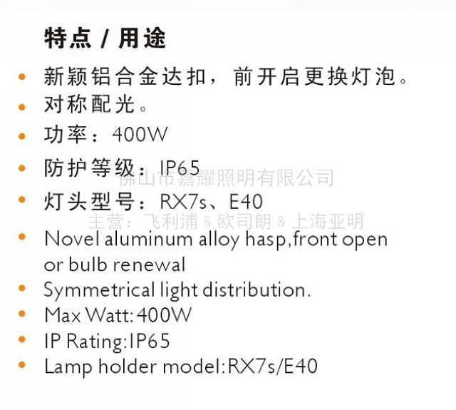 1、新颖铝合金搭扣,前开启更换灯泡。
