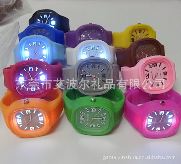发光果冻手表一词的来历:果冻手表颜色鲜艳、晶莹剔透.里面有个led灯,可以发出七色的光,产品看起来就像果冻一样,故名叫发光果冻手表。