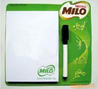 4)磁性留言板 白板:采用软胶磁铁(或纸板)+铜版纸四色印刷裱光膜+可擦笔