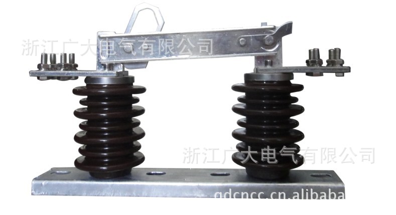 开关供三相线路系统单相使用,其结构简单、经济,使用方便。开关的额定电流由200;400;600和1000安。它们皆由底座,支柱绝缘子、导电部分和机构部分组成。采用闸刀式结构分和闸达到切断和闭合线路,每相闸刀由两片导电刀片组成,刀片两侧外装有压缩弹簧,调节弹簧的高度可以得到开关闸刀所需要的接触压力。开关分和闸时用绝缘钩棒操作机构部分便可以进行合闸运动。闸刀由自锁装置。开关的外形见图一所示。