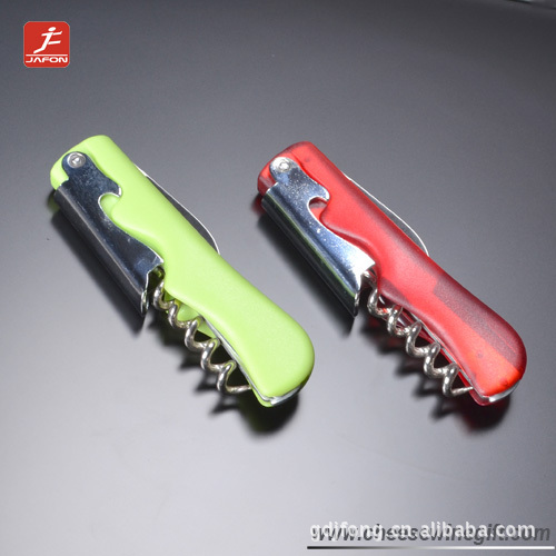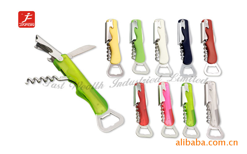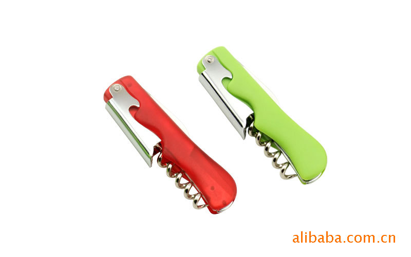 部件为全不锈钢塑料柄虾头开瓶器,由啤酒开(开啤酒和拔木塞时作为支点),不锈钢螺丝钻(钻进木塞)和带锯齿小刀(割锡箔封口纸)三个主要部分组成,简单易用,是拔酒瓶木塞的绝佳工具。一个让人惊叹不已的设计,它的出现,是真正的开瓶器之王 。
