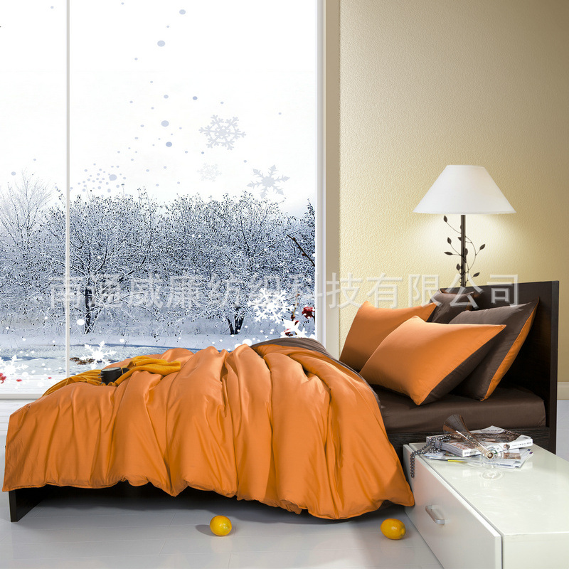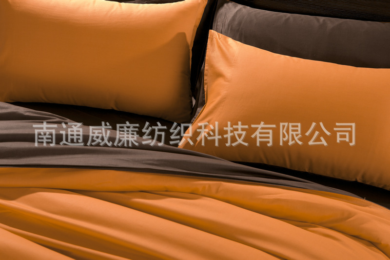 本系列四件套采用133*72全棉斜纹纯色面料,活性印染工艺,不易褪色,不易起球,手感更柔软。在床品花色繁多,花型令人眼花缭乱之时,本公司推出的这款休闲素色四件套,意在为崇尚简约美的您提供一个心灵休息的驿站。
