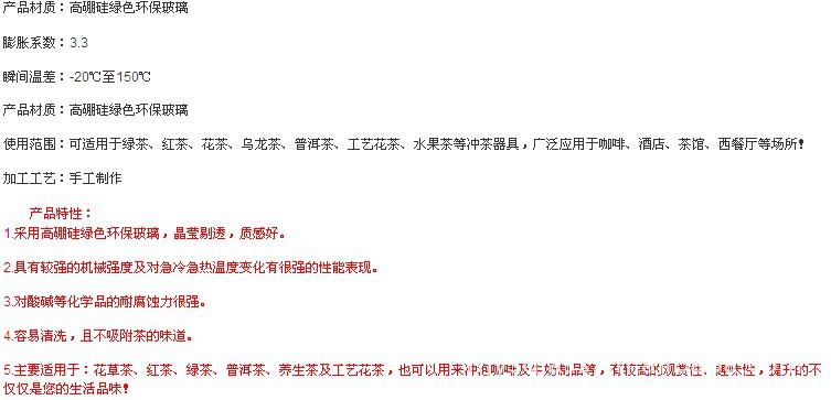 产品描述名称:功夫玻璃茶壶 单位:套材料:高硼硅 工艺:人工吹制包装:彩盒 性能:耐高温、环保、无污染、透明高、无毒无味、