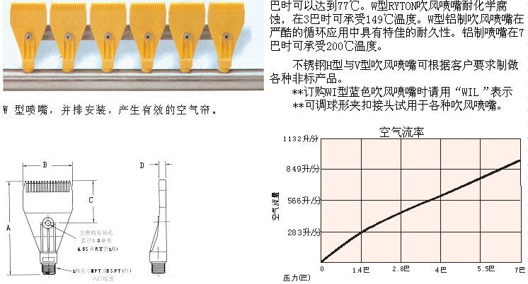W型吹风喷嘴的最大工作压力为 7巴,可承受 的最高工作温度为80℃。