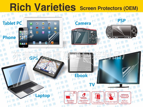 惠通专业冲形模切各种品牌手机,数码相机,游戏机,VCD、DVD、LCD液晶、PDA、MP3-4、电脑等产品的屏幕保护,产品采用台湾,日本,韩国等进口PET材质,纯硅胶处理,不缠胶,自动静电吸附,汽泡自动排空,防刮度可以达到3-4H,让您在使用过程中达到最理想的状态,我司各种品牌或型号的保护膜均可冲形,专业为您提供高品质低成本产品!