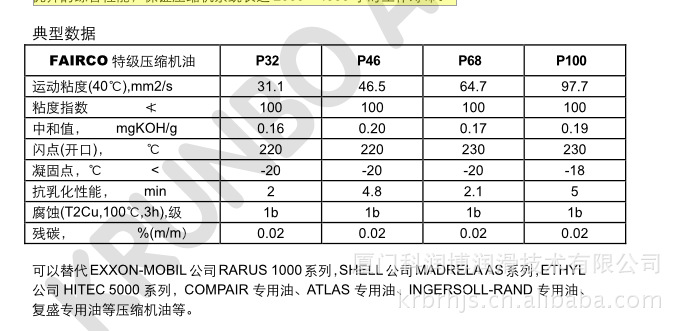 科润博 FAIRCO P32/P46/P68/P100 特级压缩机油, 是半合成基础油配合压缩机专用添