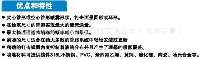 特别介绍:喷雾模式有实心锥形和空心锥形两种,最大喷流角度为60-170度。在3巴压强下,液体流率范围为5.5一140升/分。设计紧凑,具有畅通不堵塞的无内芯直通式流道设计,可使液体在给定尺寸的管道上达到最大流量。有1/4-4英寸的喷嘴规格,可选外牙螺纹、法兰安装,这种喷嘴可在绝大多数管道系统上安装和更新应用。产品材料主要有铜、不锈钢、碳化硅、塑胶、陶瓷等等。广泛应用于环保领域,如脱硫、除尘、洗涤、冷却、消防。