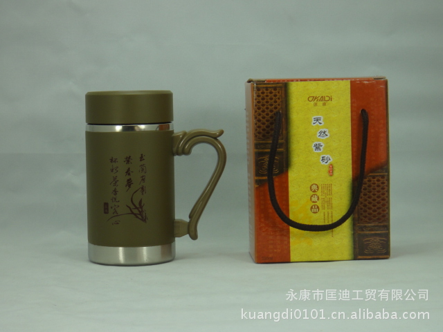 1.产品内胆纯天然紫砂泥,经高温烧制而成(含多种人体需要的微量元素和矿物质),杯身精美图案或文字,是传统和现代工艺手法相接合的典范,实为生活好伴侣,有效弥补紫砂不保温,易破损不便携带等现象,独特的气体内循环机构,避免了高真空杯易煮茶叶现象。据有泡茶不走味,盛夏不易馊,寒冬腊月,注入沸水,不因温度急交而胀裂特点。经过长时间使用后,就是到入一杯白开水,也能散发出阵阵幽香,令人心旷神怡。