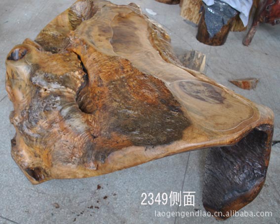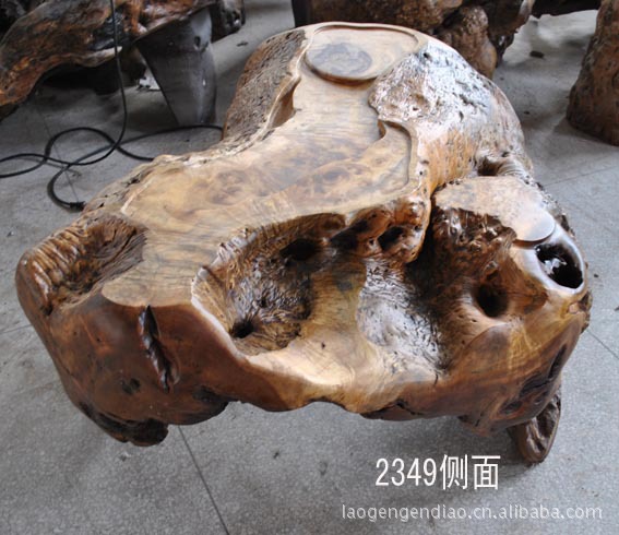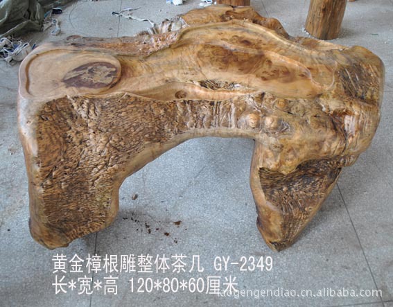 黄金樟根雕茶几:由百年黄金樟树根制作而成,茶桌造型独特唯一,完全是利用树根的造型随形加工而成,桌面纹路清晰美观,边上的瘤体包包,自然.美观。平桌面上漂亮的雀眼纹,独具特色,让人叹为观止!茶桌自身也有很强的感染力与装饰性,可单独摆放作为装饰。可用做茶台,也可用做饭桌,写字桌!既有实用性,又有装饰性。再配上几根杉木或者枣木凳子,一边喝茶一边聊天、公事,可谓惬意。
