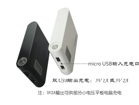 IPAD充电宝 12000毫安超大容量 双USB强光照明液晶屏电量提示功能 型号:SY-D12该款Ipad充电宝是一款非常时尚的流行的移动电源,采用液晶屏提示剩余电量,含带双USB输出充电接口,一个1A输出,一个2A输出,能满足部分平板电脑充电用,且可以当手电照明用,手机可以充电4-5次,黑白两色,钢琴烤漆,外观简易大方。除手机充电用外,也满足了IPAD电源5V2A的充电需求!产品型号:SY-D12成品容量:12000mAh输出电压:DC5.3±0.3V输出电流:Max 1A/2A输入电压:DC5.0V-6.0V输入电流: 1A-2A循环寿命:>500次尺寸:108 X 72 X 22mm灯光照明:0.5W重量:约240+5g