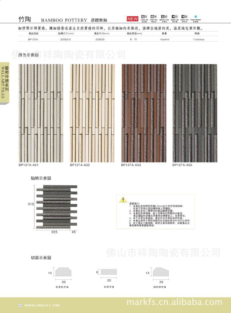 佛山市祥陶陶瓷有限公司生产的竹陶、千陶彩、劈岩石是引进日本技术,产品由于采用了与其它瓷砖不同的原料压制,加上窑炉高温烧制,产品的烧结程度比较高。因此产品具有表面自然、吸水率低、抗折强度高、抗冻融、耐久性、不褪色、不反碱等特性,而且随着岁月的流逝,产品会越发产生美感,更加体现出整个建筑物的韵味。