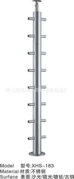 的圆棒或者圆管连接,螺丝固定,组装方便。XHS-183不锈钢栏杆柱适合平面栏杆护栏使用,不锈钢栏杆柱,适配50.8圆管做扶手面管为宜。十分欢迎国内外各大工程商,装饰公司,外贸公司来图样定制栏杆柱。